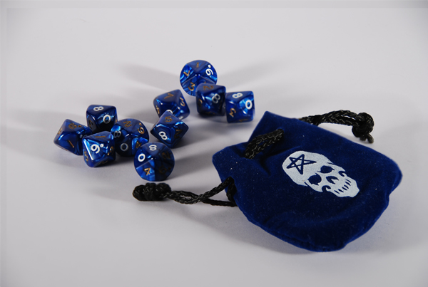 - Viennent ensuite les vrais dés de jeu de rôle... En bon emmerdeur, je vais commencer par les sets qui ne viennent pas de chez White Wolf; il y en a 10 ils sont bleus